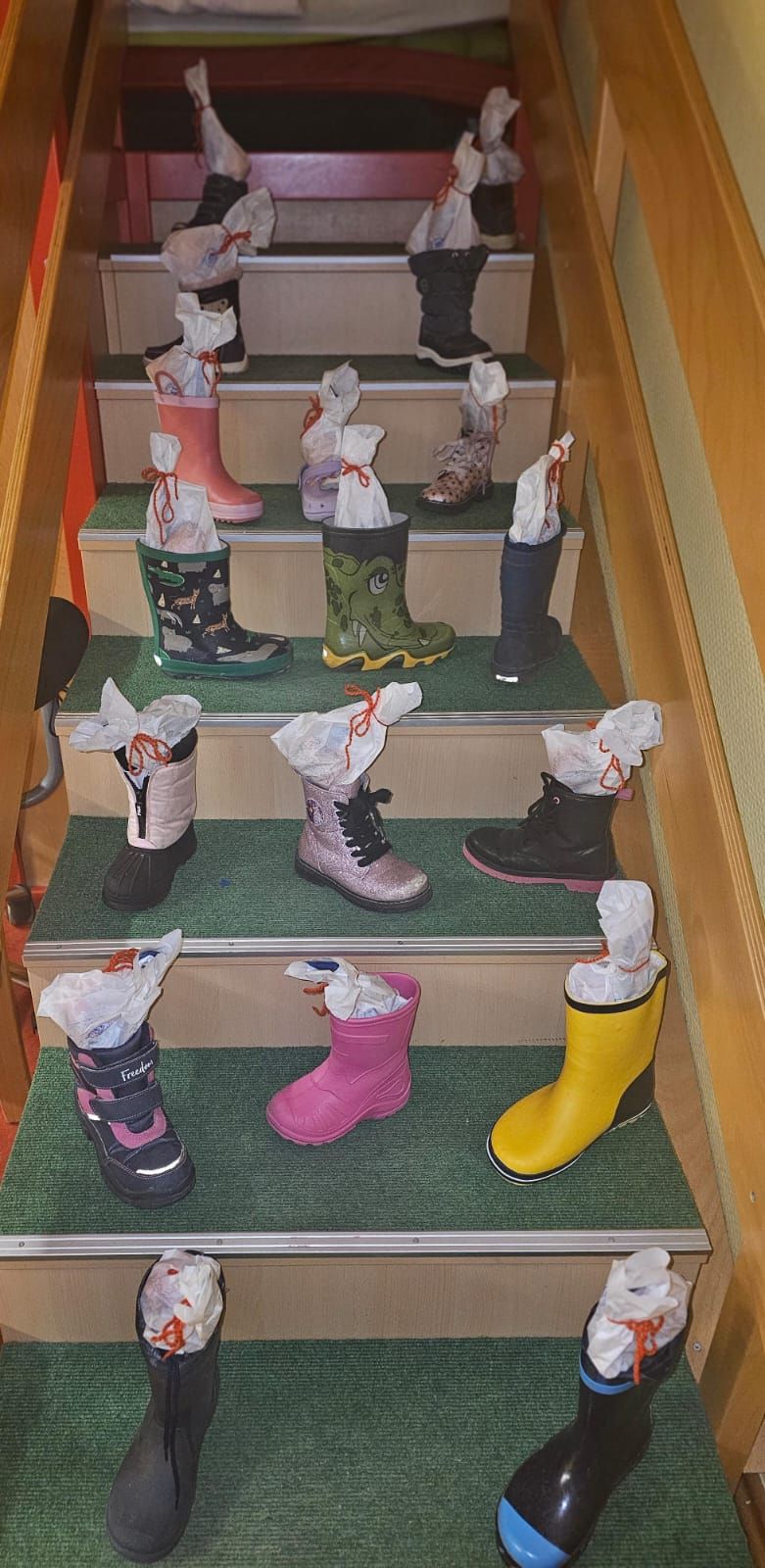 …natürlich, die fleißig geputzten Schuhe waren gefüllt. Mit leuchtenden Kinderaugen wurden die Stiefel betrachtet und das ein oder andere Schokoladenstück gekostet. Teilweise hatten sogar die Eltern an der Nikolausüberraschung mitgewirkt.