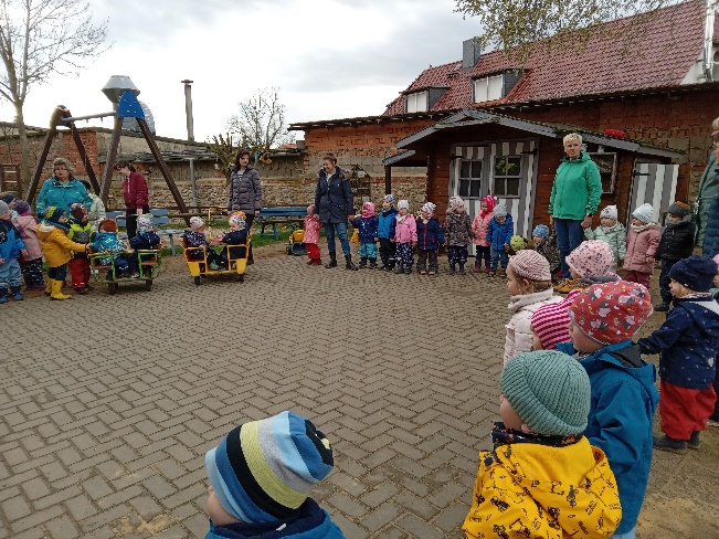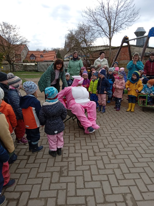 Endlich, die KiTa-Leiterin Kerstin Busse stimmte mit der Wichtelgruppe österliche Klänge an, um den Osterhasen zu locken. Doch damit nicht genug, sie animierte die Kinder lautstark nach ihm zu rufen- bis plötzlich der Osterhase in einer Schubkarre zum Vorschein kam. Die Kinder waren sichtlich begeistert.