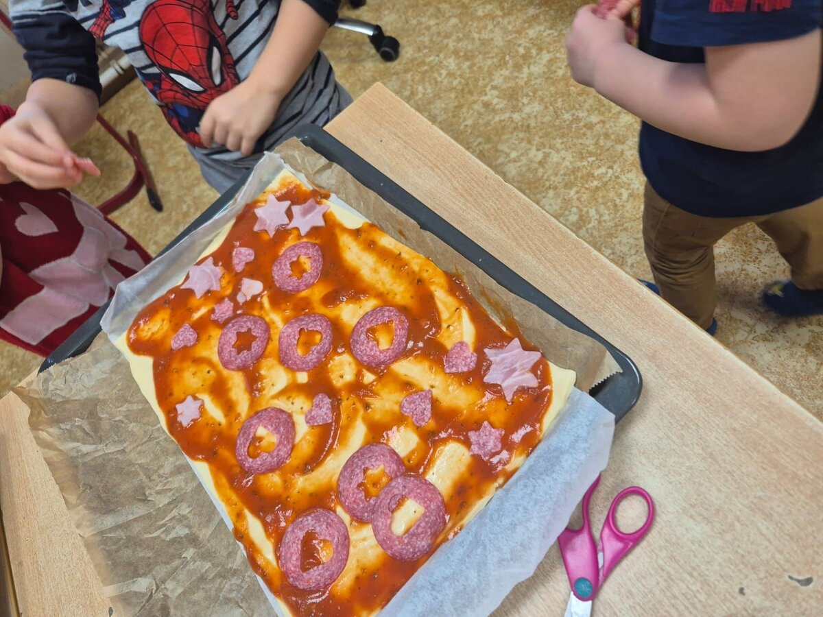 das gemeinsame Pizza backen, bei dem Teig geknetet und Beläge ausgewählt wurden,
