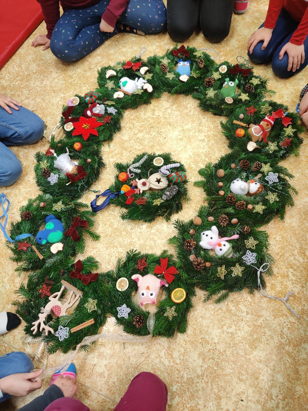 das Binden von Türkränzen gemeinsam mit Bea Herzallerliebst, wodurch die Gruppenräume festlich geschmückt wurden,