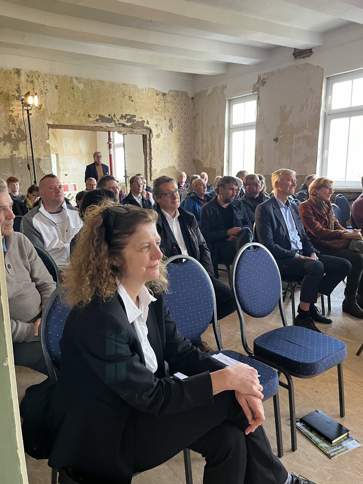 Prof. Dr. Harald Garrecht erläuterte, wie die Ergebnisse aus dem laufenden Forschungsprojekt in der Hamburger Speicherstadt weiterentwickelt und an die spezifischen Bedingungen des Ritterguts in Gröningen angepasst werden. Besonderes Augenmerk liegt dabei auf dem historischen Fachwerkgebäude mit Lehmwänden: Hier wird erstmals ein Dämmputz auf Aerosol-Lehmbasis eingesetzt, der die thermische Effizienz erhöht, ohne die Bausubstanz oder die historische Erscheinung zu beeinträchtigen.