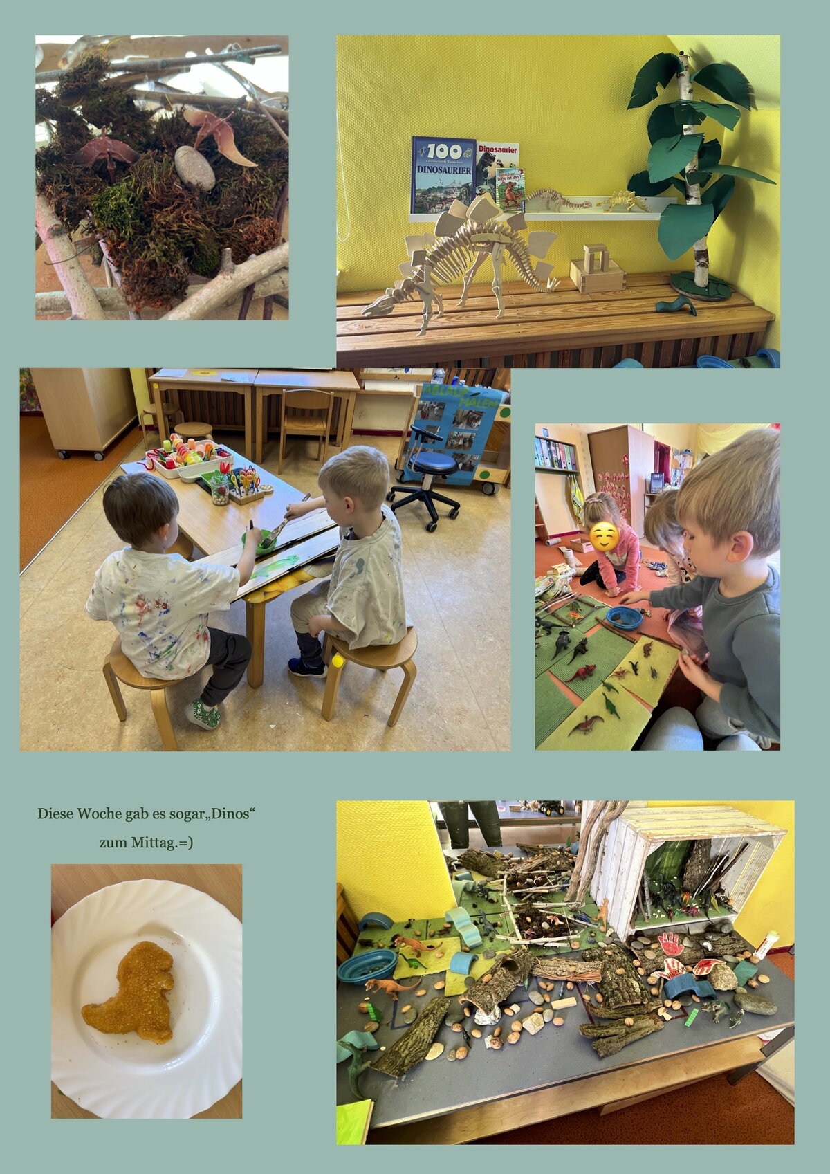 Im Bauraum entstand aus Holz, Steinen, Blättern und vielen weiteren Naturmaterialien eine beeindruckende Dinosaurierlandschaft. Mit großer Begeisterung gestalteten die Kinder ihre eigene Urzeitwelt, in der zahlreiche Dinos ihren Platz fanden. Passend zum Thema überraschte sogar das Mittagessen mit einer kleinen „Dino-Idee“, die für viele strahlende Gesichter sorgte.