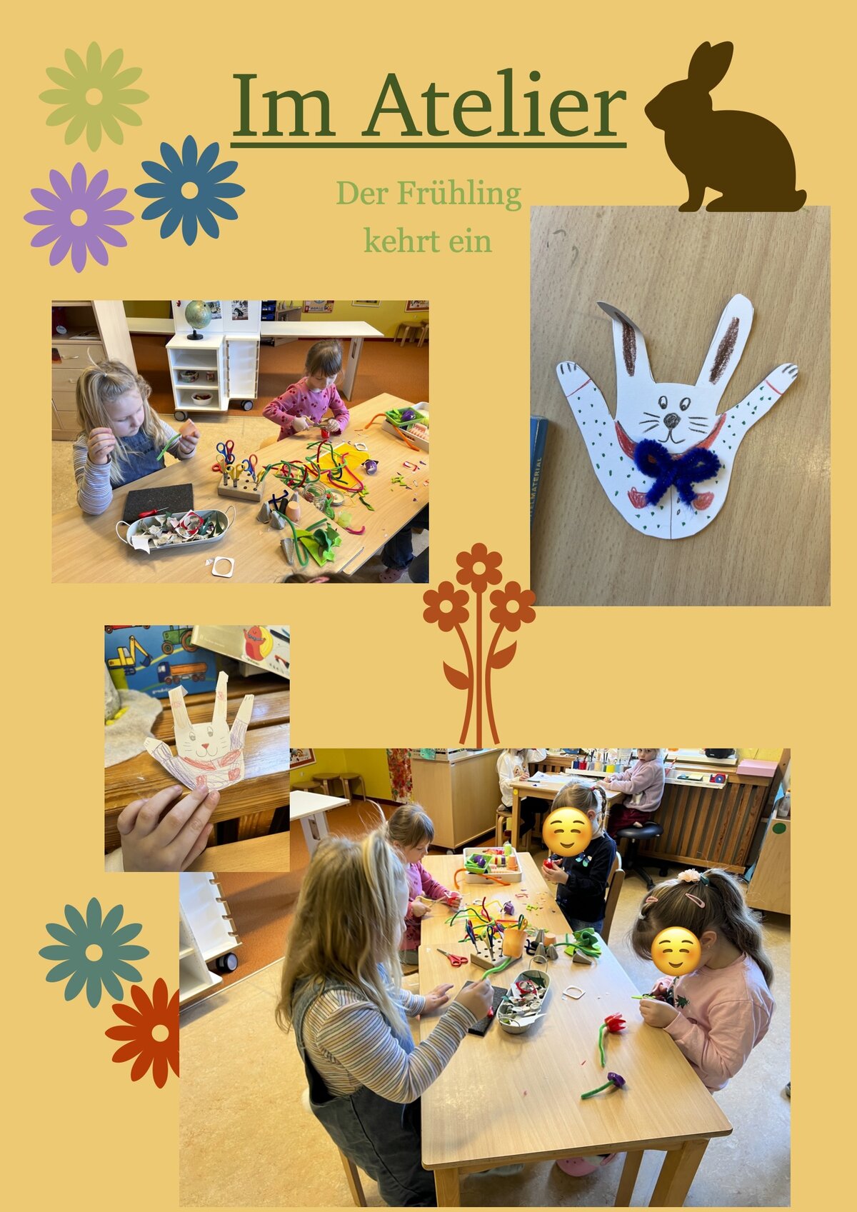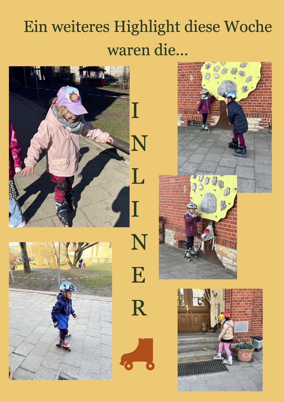 Auch im Atelier hielt der Frühling Einzug: Farbenfrohe Bilder und kreative Bastelarbeiten zeigten, wie die Kinder die neue Jahreszeit wahrnehmen und gestalten. Ein weiteres Highlight der Woche war die Bewegung auf Inlinern, bei der Geschicklichkeit, Balance und Spaß im Vordergrund standen.